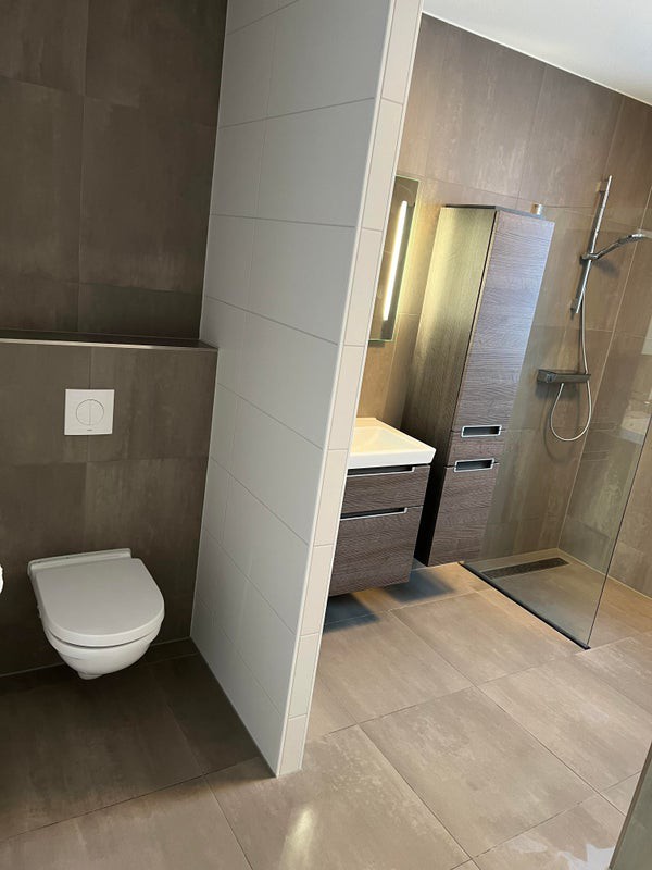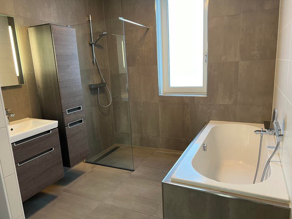 De badkamer is ruim opgesteld en voorzien van een ruime inloopdouche en een wandmeubel met wasbak, extra toilet en een ligbad.