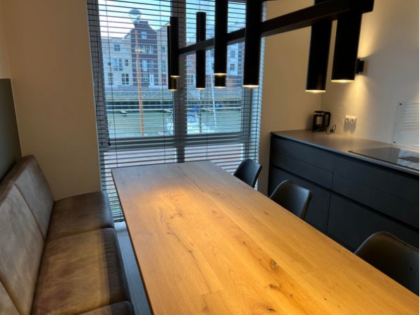 De moderne industriële leefkeuken beschikt over diverse (inbouw)apparatuur zoals koelkast, vriezer, inductie kookplaat met geïntegreerde afzuigkap, combi-magnetron, koffiezetapparaat en een vaatwasser allen van het merk AEG mat staal variant. De indeling zorgt voor voldoende werk- en opbergruimte.