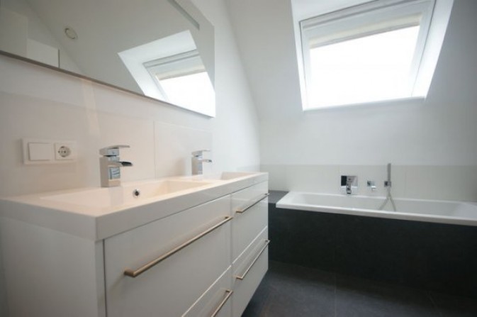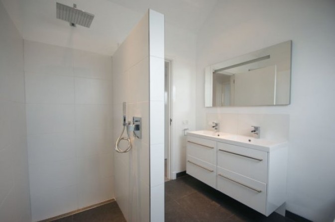 De badkamer is uitgevoerd met inloopdouche, ligbad en dubbele wastafel en is afgewerkt met luxe natuurstenen tegels.