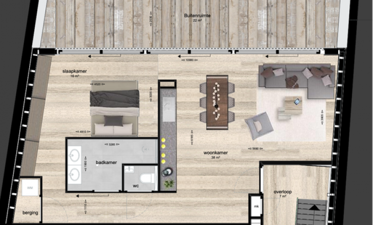 Entree/ gang met toegang tot het toilet en de woonkamer van 29 m2. Via de woonkamer heeft u toegang tot de berging waar een aansluiting voor de wasmachine is. Via de woonkamer komt op de overloop die toegang geeft tot de aparte toilet, de badkamer van 8 m2 met dubbele wastafel en inloopdouche en de slaapkamer van 14 m2.